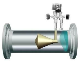 錐形流量計是在管道中芯處懸掛一錐形節流件,錐形件阻礙介質的流動,重塑流速曲線,在錐形性的下游可立即形成低壓區,管道上游的正壓同經節流件節流后的下游的負壓之間有一差壓,將正、負壓用取壓口取出,正壓口位于管道的上游,負壓口位于錐體的末端,通過測量兩者之間差壓,根據伯努力方程即可計算出管道中的流量,錐體位于管線中芯,可對所測介質的流速曲線進行優化,因此測量精度高,對儀表上、下游的直管段要求低。